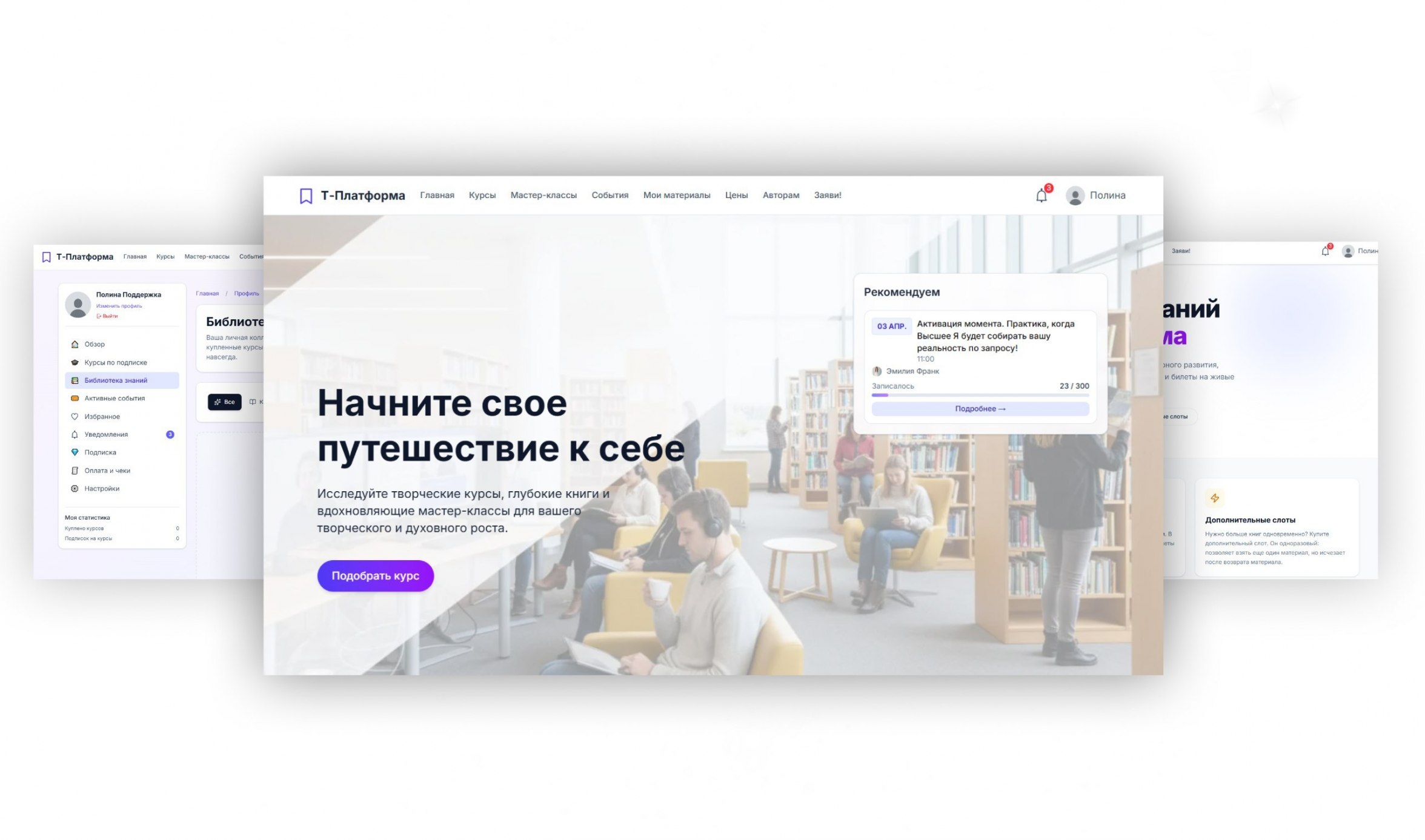Платформа реализована в виде трёх функциональных модулей: «Онлайн-библиотека» (каталог, выдача контента и управление подписками), «Афиша» (навигация по вебинарам и запись на мероприятия) и «Календарь» (административная панель для управления контентом, пользователями и настройками системы).