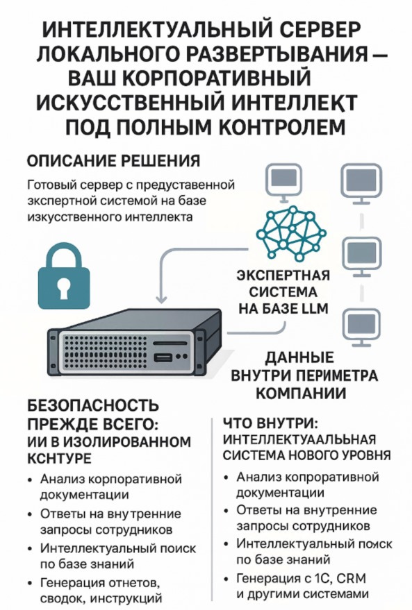 Готовый сервер с предустановленной экспертной системой на базе искусственного интеллекта, развертываемый в локальном контуре вашей организации.